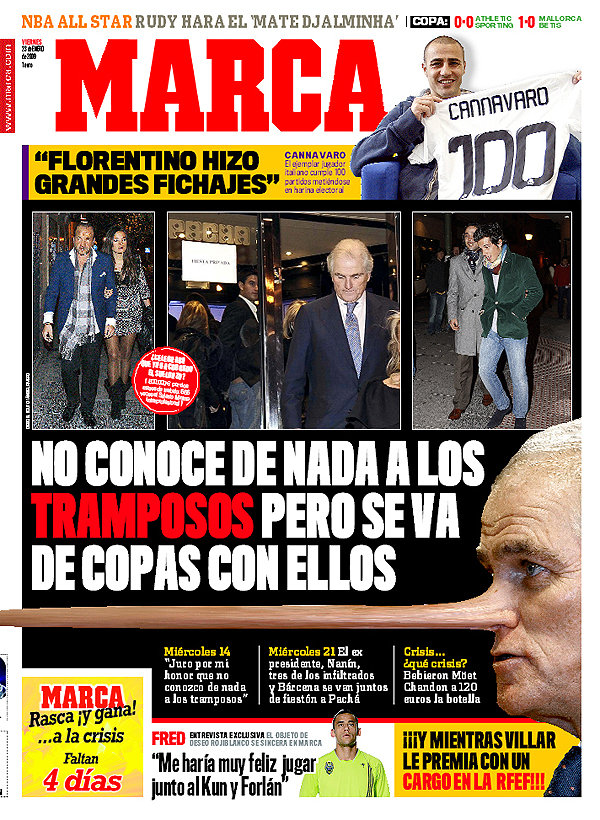 Pasada la una de la mañana, Bárcenas se asoma a la puerta principal, y al ver que hay medios esperando en la entrada, nos trampea, muy en su línea, saliendo por una puerta trasera, claro que la policía no es tonta y le descubrimos. Cinco minutos más tarde Ramón Calderón y su mujer, tal vez advertidos por Bárcenas de que no se pueden escapar sin que les veamos, aparecen por la puerta principal, con gesto serio, y sólo mostrando esa sonrisa de “…dientes que es lo que les jode…”. Unos infiltrados más tarde, como a las dos de la mañana aparece Nanín, que resopla cuando ve que aún estamos en la puerta esperando; quizás sea que no le gustan los medios, sobre todo los que no le pagan… (hablan ya de cifras millonarias para una entrevista a Nanín en tv).